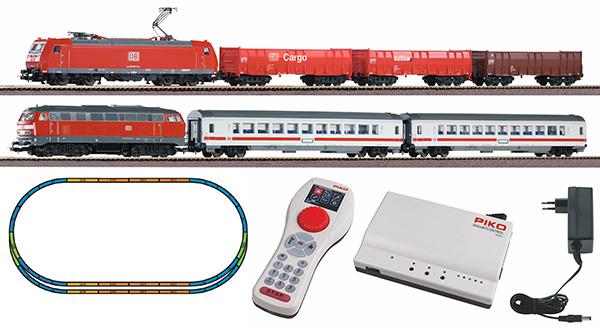 Электровоз 185 и 3 грузовых вагона Тепловоз БР 218 и 2 пассажирских вагона Двойной овал 182 x 95 см Трансформатор Цифровой усилитель PIKO SmartControlwlan basic set Пульт PIKO Digi-Fern Железная дорога - DB Эпоха - IV Цифровой, постоянный ток HO Руководство по эксплуатации на английском языке https://www.piko-shop.de/en/psc-wlan.html